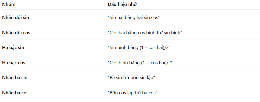 Nhóm công thức này là ngược lại của phần trước (tổng → tích).