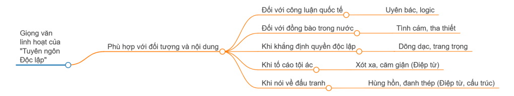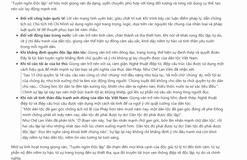 Khi thì hùng hồn, đanh thép (như trong Tuyên ngôn Độc lập), khi lại mềm mại, thân mật, gần gũi (như trong các thư, lời kêu gọi). Giọng điệu đó thể hiện tình yêu nước sâu nặng, lòng thương dân chân thành.