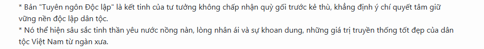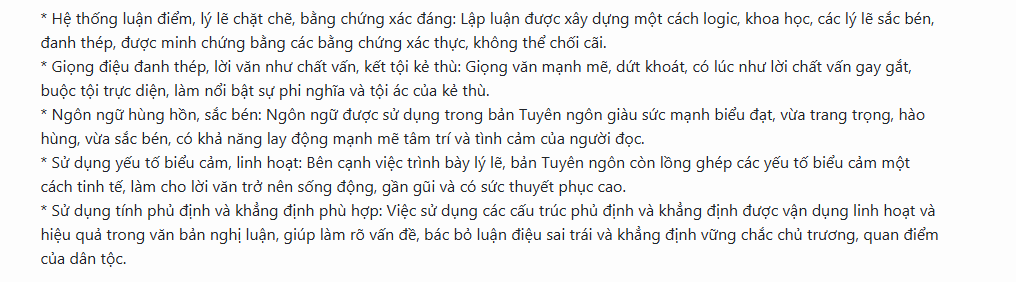 • Từ ngữ kế thừa và phát triển: Sử dụng các từ khóa về công lí và chính nghĩa (“quyền bình đẳng”, “quyền tự do”) từ các tuyên ngôn quốc tế, sau đó phát triển thành “quyền dân tộc”, nâng cao vị thế pháp lý của Việt Nam.