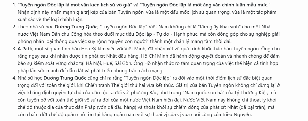 Bản “Tuyên ngôn độc lập” không chỉ là một văn kiện có giá trị lịch sử mà còn là một áng văn chính luận hào hùng, mẫu mực; một áng văn tràn đầy tâm huyết, khát vọng cháy bỏng về độc lập, tự do của Người và của cả dân tộc. Nó có sức mạnh thuyết phục to lớn, làm rung động hàng triệu trái tim yêu nước Việt Nam.