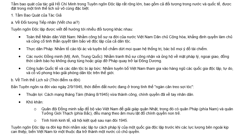 Câu 38: Viết đoạn văn (khoảng 150 chữ) nêu suy nghĩ của bạn về khả năng tác động lớn lao của Tuyên ngôn Độc lập.