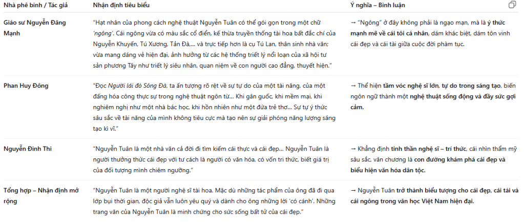 Cá tính “viết cho ra, viết cho nổi nét đặc biệt”: Câu kết luận của bạn hoàn toàn chính xác. Nguyễn Tuân không bao giờ viết một cách hời hợt. Ông luôn đào sâu, tìm tòi để “viết cho ra” cái đặc sắc nhất của đối tượng. Với cảnh đá bờ sông, ông đã làm nổi bật sự hiểm trở, hoang vu và cả những cảm giác mà nó gợi lên, thể hiện rõ cá tính và sự cầu toàn trong nghệ thuật của ông.