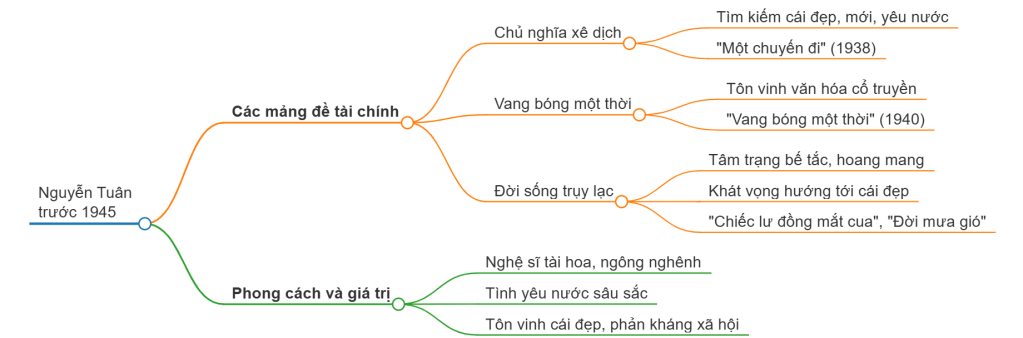 Văn chương Nguyễn Tuân trước Cách mạng chủ yếu xoay quanh ba mảng đề tài lớn: chủ nghĩa xê dịch, vang bóng một thời và đời sống trụy lạc.